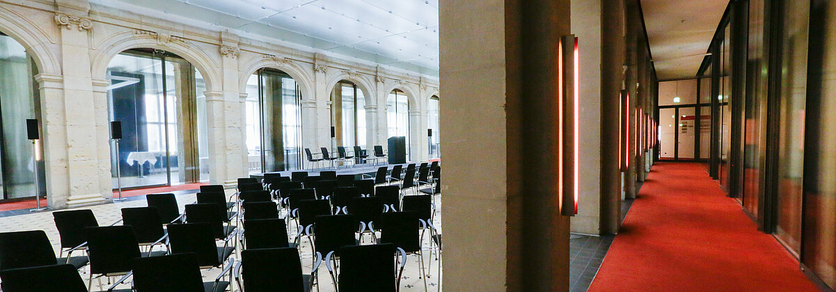 Großzügige Arkaden umgeben den Leibniz-Saal und bilden gleichzeitig die Verbindung zu den zum Gendarmenmarkt gelegenen Konferenzräumen 4 – 6 und zu dem zum Innenhof gelegenen Cateringbereich.